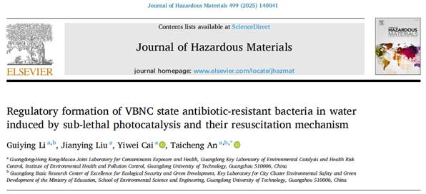 近日,广东工业大学环境健康与污染控制研究院、环境科学与工程学院安太成教授团队题为《Regulatory formation of VBNC state antibiotic-resistant bacteria in water induced by sub-lethal photocatalysis and their resuscitation mechanism》的学术论文在Journal of Hazardous Materials,2025, 499: 140041杂志上发表(https://doi.org/10.1016/j.jhazmat.2025.140041)。论文的第一作者为李桂英教授,主要作者还包括2023届硕士毕业生刘建莹和博士后蔡仪威,通讯作者为安太成教授。该研究主要关注亚致死光催化诱导后活的不可培养(VBNC)抗生素耐药菌的形成及其复苏机制,主要阐明了抗生素耐药菌在亚致死光催化下诱导进入VBNC状态以及恢复至正常状态的全过程中生理生化特性变化,系统揭示了细菌胞内氧化还原平衡和能量代谢平衡的恢复是VBNC抗生素耐药菌复苏的调控机制。该研究为VBNC细菌的形成和复苏提供了新的研究视角,有助于未来抗生素耐药性的环境控制,以及对后续深入探讨和明确VBNC细菌恢复过程中的具体调控机制具有一定的指导意义。