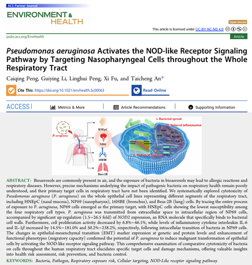 近日,广东工业大学环境健康与污染控制研究院、环境科学与工程学院安太成教授团队在生物气溶胶中关键组分的健康风险评估方面取得最新研究进展,研究成果以《Pseudomonas aeruginosa Activates the NOD-like Receptor Signaling Pathway by Targeting Nasopharyngeal Cells throughout the Whole Respiratory Tract》为题发表在Environment & Health (2025, https://doi.org/10.1021/envhealth.5c00063)期刊上,并被评选为当期补充封面文章。论文的第一作者为博士生彭彩青,通讯作者为安太成教授。