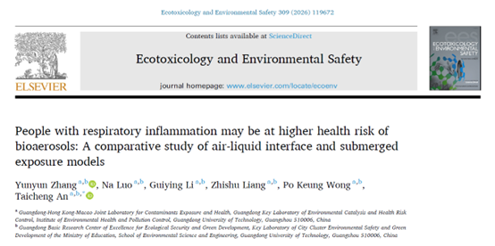 近日,广东工业大学环境健康与污染控制研究院、环境科学与工程学院安太成教授团队在生物气溶胶健康风险评估研究方面取得重要进展,相关研究成果以“People with respiratory inflammation may be at higher health risk of bioaerosols: A comparative study of air-liquid interface and submerged exposure models”为题,发表于国际期刊Ecotoxicology and Environmental Safety (2026,309,119672)。论文的第一作者为博士生张芸芸,主要作者还包括李桂英教授、梁志梳副教授、王保强教授和博士后罗娜,通讯作者为安太成教授。该研究主要构建了两种体外细胞暴露模型:模拟正常呼吸道上皮的气液界面(ALI)模型,以及模拟病理性气道表面液体(ASL)积聚的新型浸没暴露模型,用于评估铜绿假单胞菌生物气溶胶的细胞毒性。不同暴露模型中生物气溶胶毒性效应的差异强调了暴露微环境在健康风险评估中的重要性。机制分析阐明了呼吸道炎症患者的病原易感性的核心机制,即病理性积聚的ASL通过宿主粘蛋白高分泌与病原体粘附素协同上调,驱动病原体的定植。此外,该研究还可以为开发具有生理相关的先进体外呼吸暴露模型提供一定理论基础。