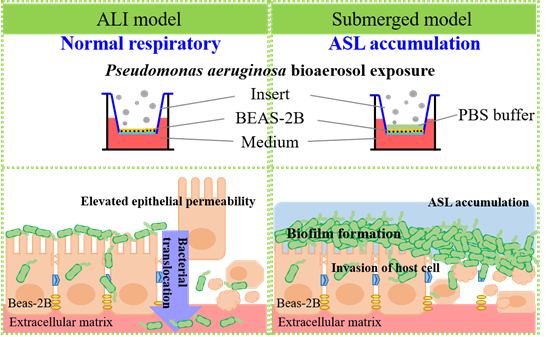 生物气溶胶暴露与多种急性或慢性呼吸道疾病的发生显著相关。然而,其毒理机制尚未完全阐明,暴露模型是一项关键限制因素。尽管ALI模型被广泛认为能较为真实地模拟健康人群的气道微环境的体外暴露模型,在以炎症为特征的各类呼吸道疾病常伴随着ASL异常积聚的症状,在上皮表面形成局部“浸没”的微环境。这种病理状态可能显著改变宿主-病原体互作模式,增加对吸入性病原体的易感性。尽管具有明确临床相关性,目前仍缺乏对病原体在ALI与ASL积聚条件下毒理学效应的系统性比较研究。为此,本研究构建了一种新型浸没式暴露模型,即通过在上皮细胞表面覆盖定量缓冲液层以模拟病理性ASL积聚,并与模拟健康气道微环境的ALI模型对比,系统评估铜绿假单胞菌生物气溶胶的毒理效应。研究发现:ASL积聚微环境显著增强铜绿假单胞菌生物气溶胶的细胞毒性。在浸没式暴露模型中,ASL积聚不仅复制了呼吸道炎症的粘液高分泌特征,还诱导细菌粘附素上调,增强细菌粘附、侵袭与生物膜形成能力,最终导致细胞毒性增强。而在ALI暴露模型中,抑制的连接蛋白修复反应导致旁细胞通透性升高,驱动细菌跨上皮移位。本研究不仅可以阐明呼吸道炎症患者的病原易感性的核心机制,更可以为病理相关的体外呼吸道暴露模型的发展提供了一定模型基础。